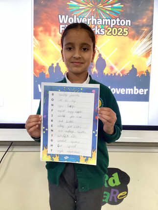 To build on their learning and capture the spirit of Bonfire Night, the children created their own acrostic poems using the letters of “BONFIRE.” They chose powerful words and imagery to represent the colours, sounds, and excitement of the night sky. Later, they confidently performed their poems aloud, using expression, tone, and intonation to bring their writing to life.
